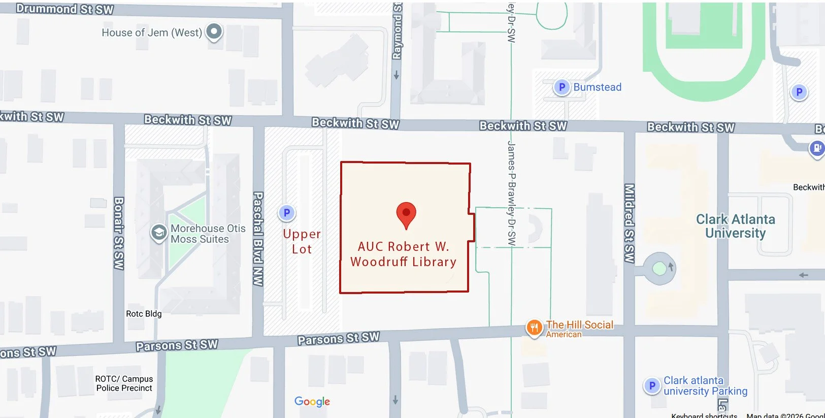 The Robert W. Woodruff Library is located at 111 James P. Brawley Drive SW Atlanta, GA 30314. The reception will be held in the Quiet Study room. Parking is free in the upper lot after 5pm. Visitors can enter through the loading dock or the front entrance. For more information on parking, visit: https://www.auctr.edu/visit/directions-and-parking/